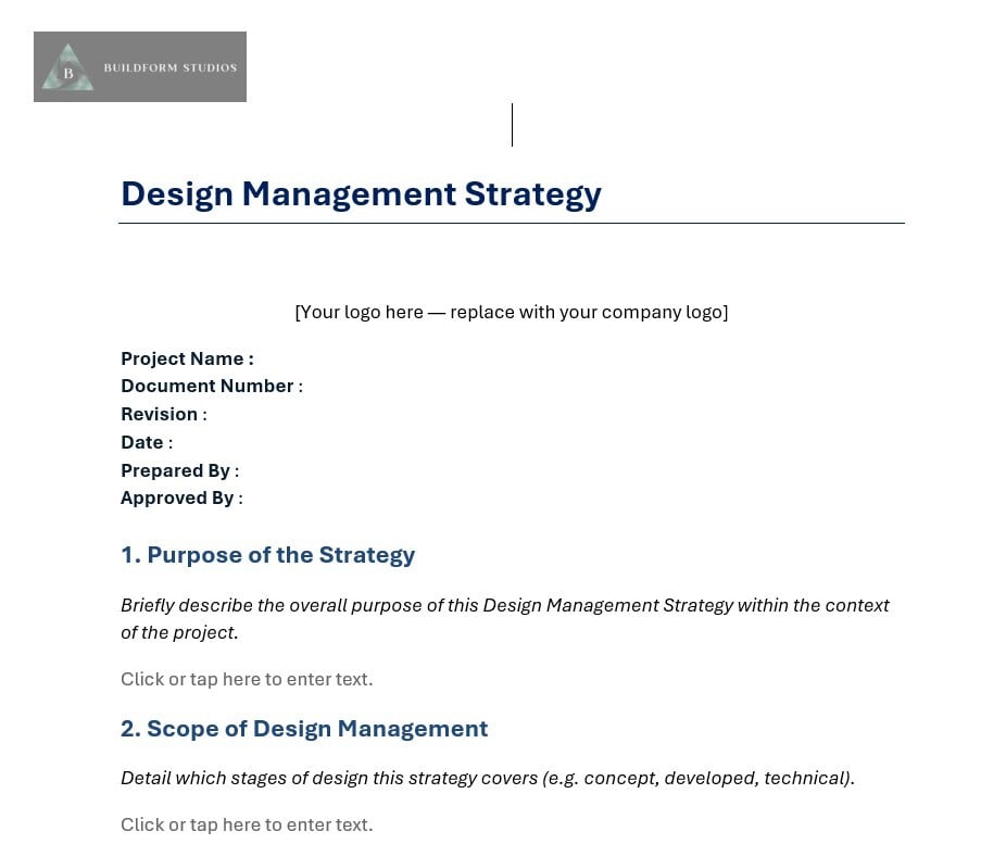 These templates are designed to assist with the structured management of design across construction projects. Final responsibility for design coordination, compliance, and dutyholder roles remains with the appointed parties. Documents should be tailored to suit the specific project stage and team structure.